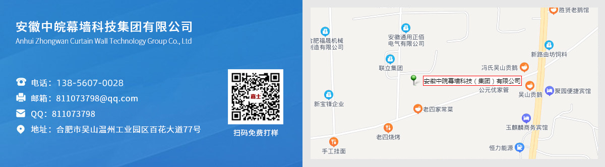 安徽中皖幕墻科技(集團)有限公司 安徽中皖集團是一家幕墻鋁單板生產、研發、設計、銷售一體化的現代化建筑環保裝飾建材企業。 旗下控股公司: 安徽嘉士新型材料有限公司 安徽博利泰幕墻有限公司 安徽泰鋁裝飾建材有限公司 中皖旗下品牌通過ISO9001;2015國際質量體系認證和ISO14001;2015環境管理體系認證,中國建材認證ctc認證的專業認證書。并榮獲重合同守信用企業;認證證書;重質量守信用企...